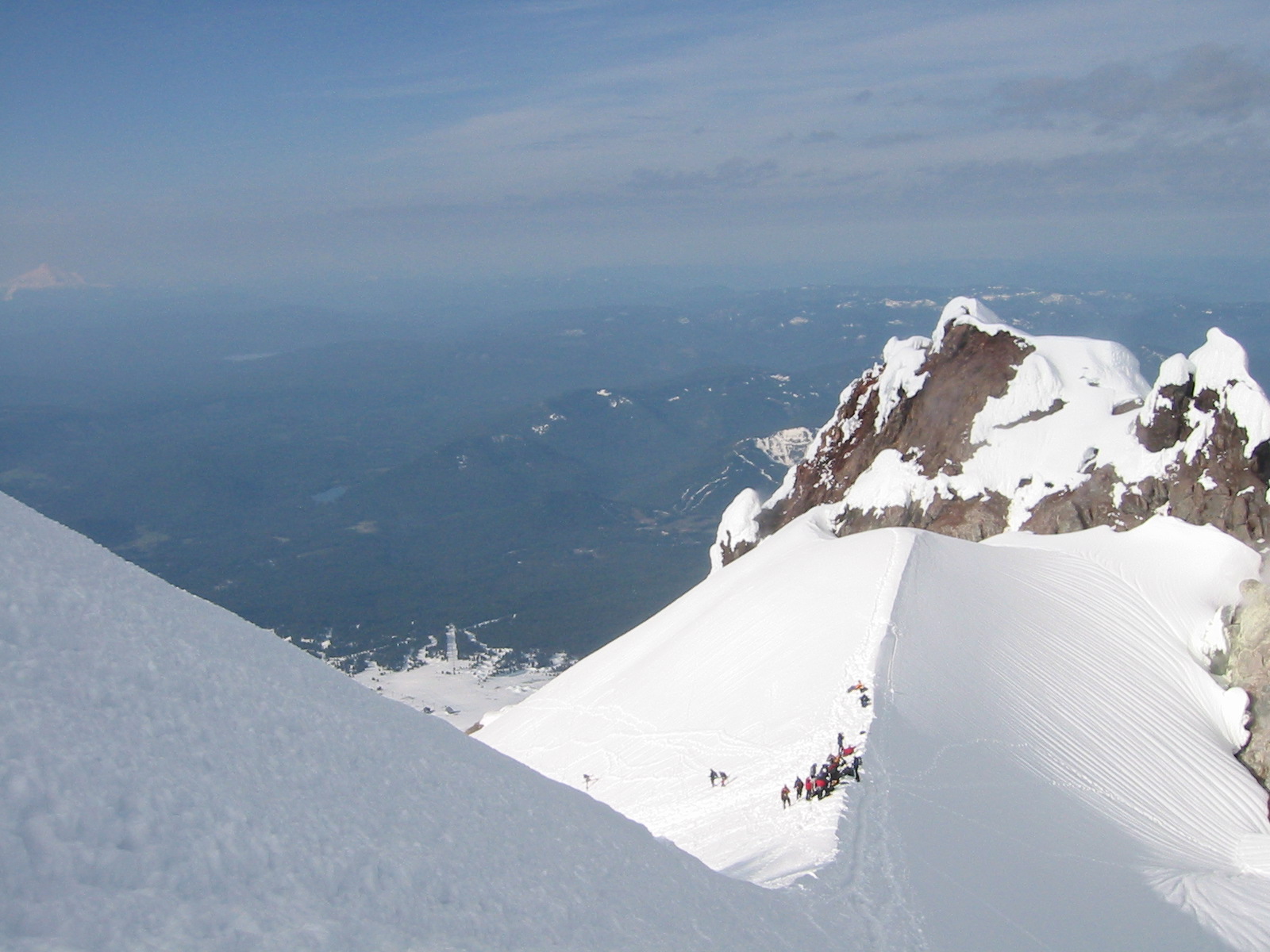 The view from the summint wasn't the greatest, but you can still see the Cloumbia River, if you look real close. Yep, that 's how you get to the top, climb that ridge Lest anyone think we had a secluded hike. There were maybe 100 people climbing. This is a view from the Pearly gates, just below the summit looking at Crater Rock. Mt. Jefferson is on the left.