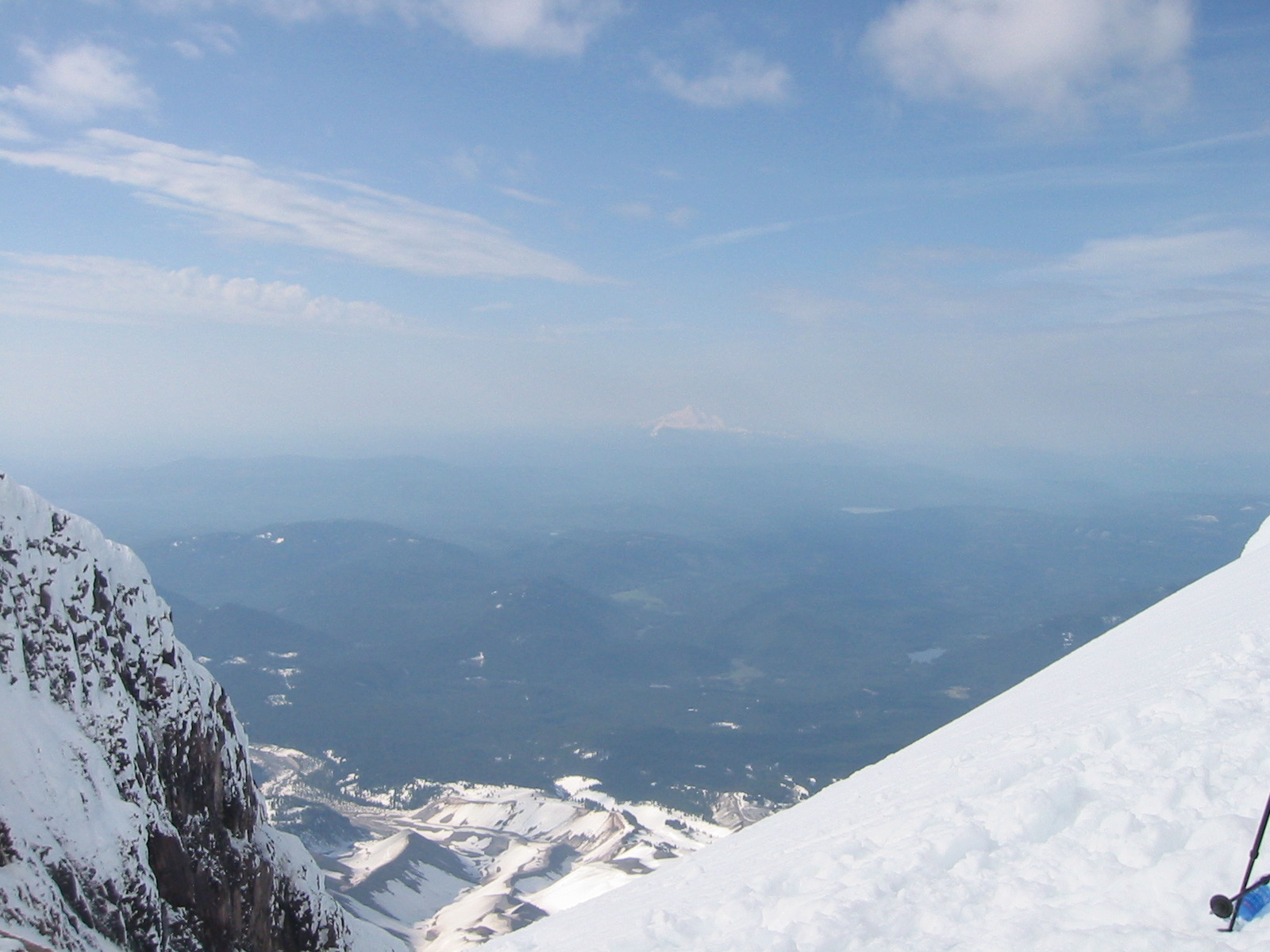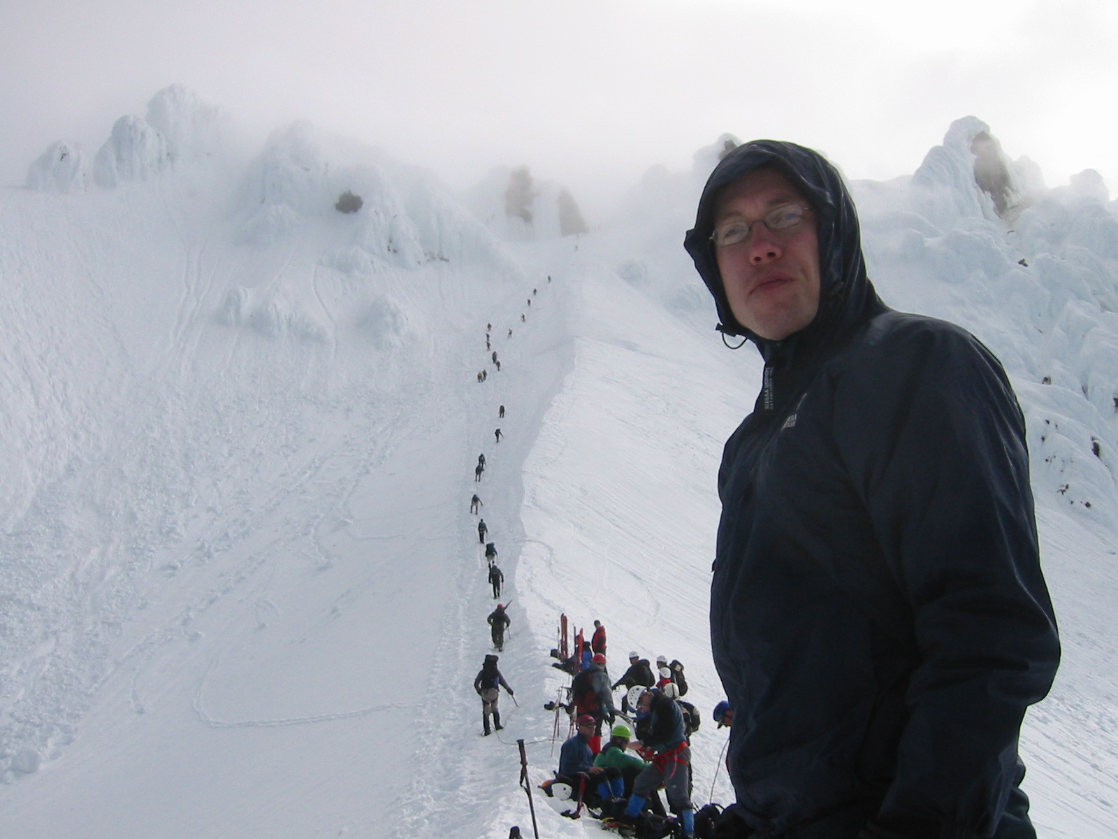 Joe, looking real warm. The picture looks back at the summit. We're on our way down. See all the people still going up. The line of people lead to an area called the Pearly Gates. Cross that and you're at the summit. After reaching the summit some people ski down from here. Here's another view of Mt. Jefferon. Looking back at the Summit from the parking lot. Mt. Hood is 11,239 feet high. The highest point in OR.